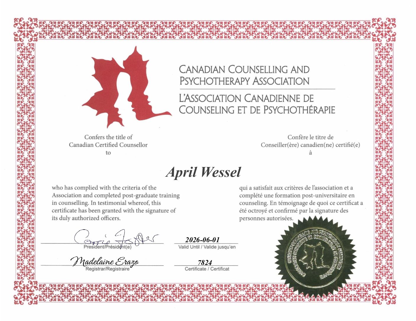 I am a professional member of the Canadian Counselling and Psychotherapy Association (CCPA) possessing a Canadian Certified Counselling (CCC) designation.